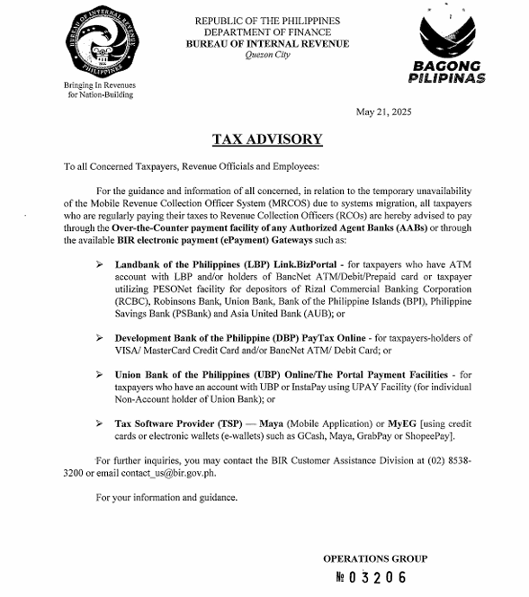 Due to temporary unavailability of the Mobile Revenue Collection Officer System (MRCOS), all taxpayers who are regularly paying their taxes to Revenue Collection Officers (RCOs) are hereby advised to pay through the Over-the-Counter payment facility of any Authorized Agent Banks (AABs) or through the available BIR electronic payment (ePayment) Gateways